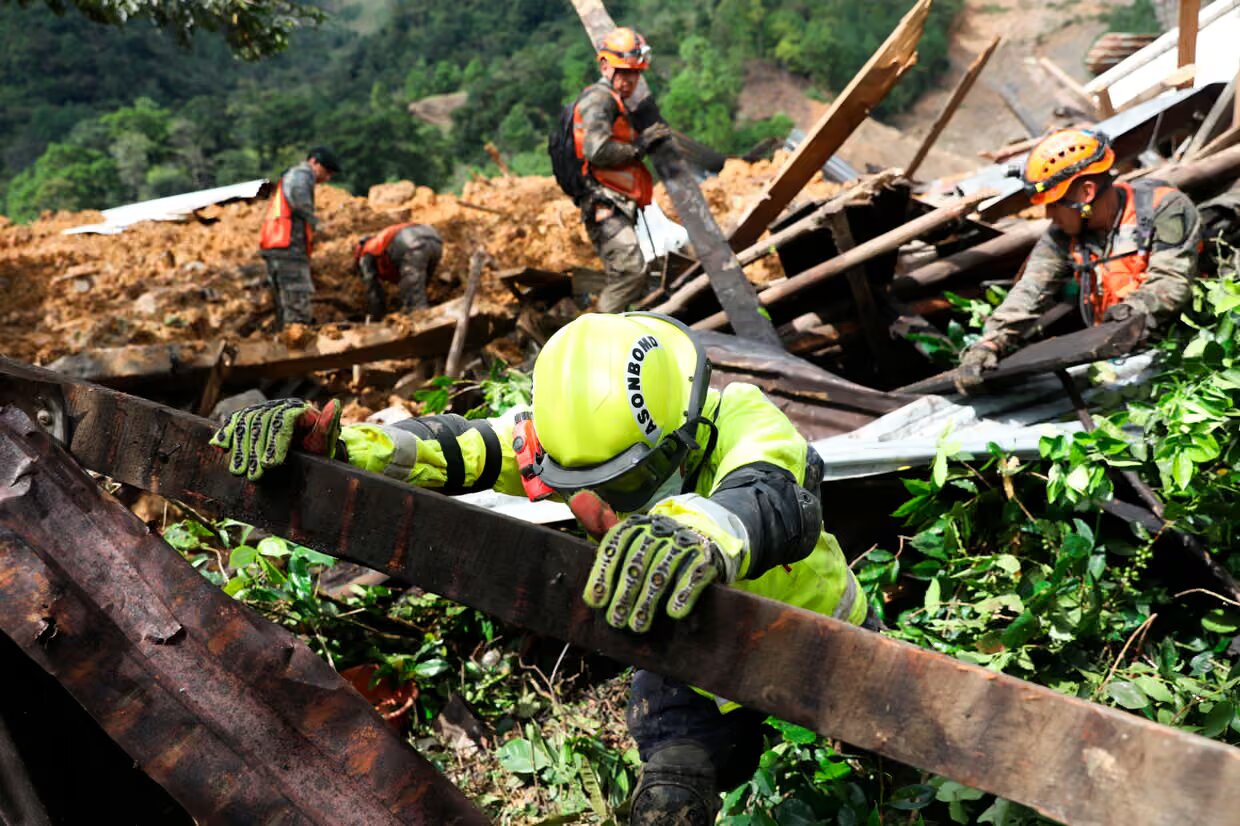 Rescue workers search for victims of a mudslide caused by the passage of Hurricane Eta in the village of Queja, in San Cristóbal Verapaz, Guatemala on 7 November 2020. Photograph: Esteban Biba/AFP via Getty Images