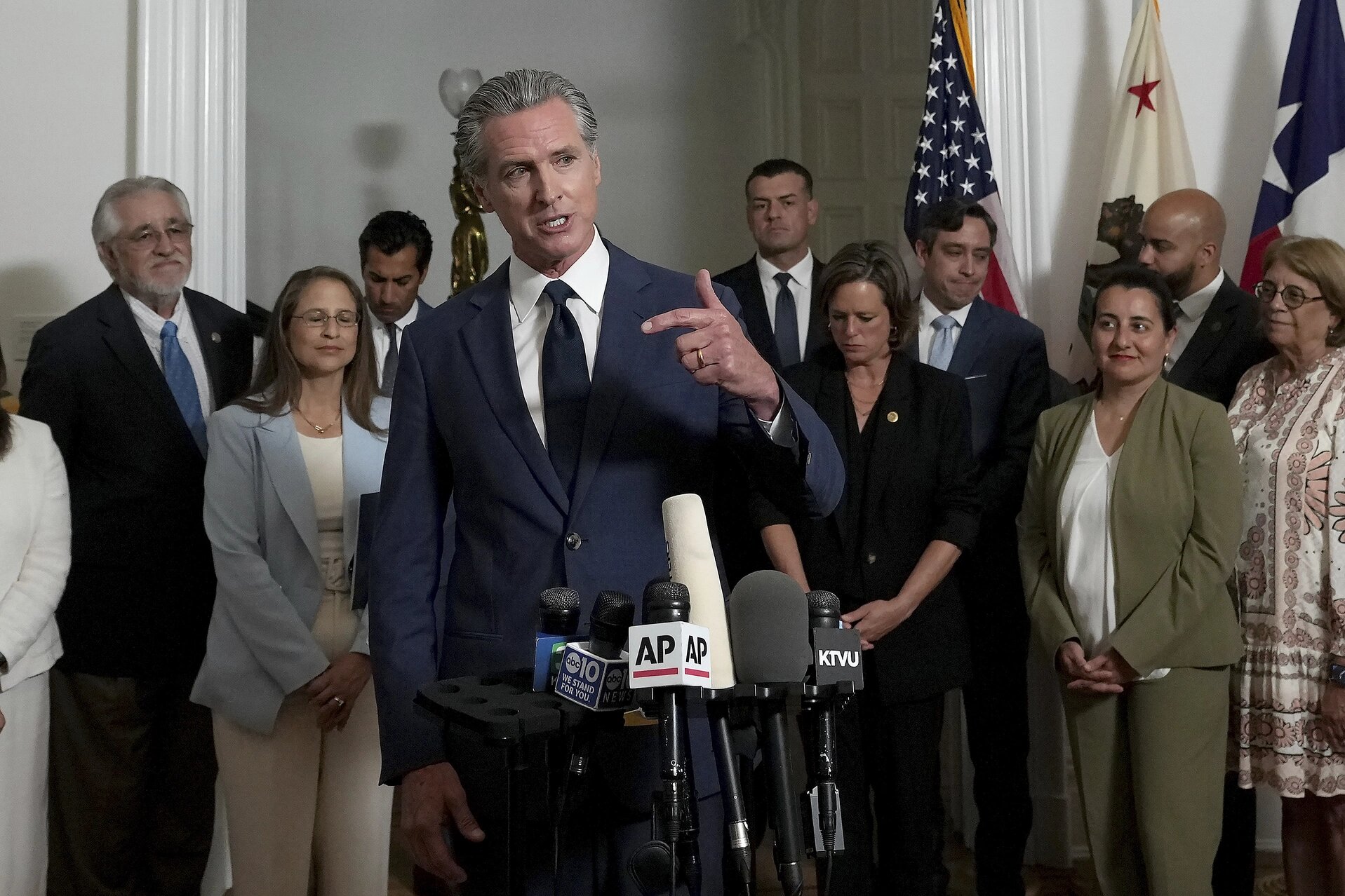 Accompanied by Democratic lawmakers from California and Texas, Gov. Gavin Newsom talks about redistricting during a Sacramento news conference in August. | AP Photo/Rich Pedroncelli