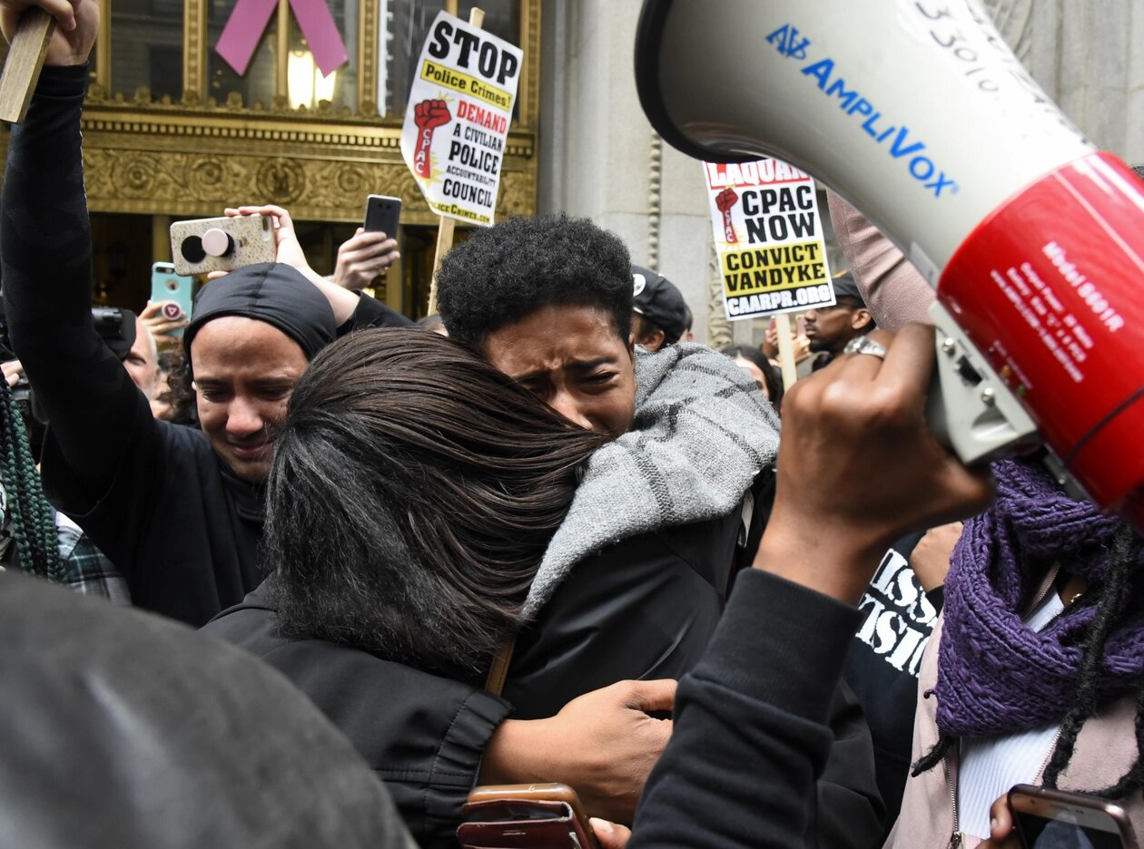 People react outside the city hall in Chicago on Friday, Oct 5, 2018, after a jury convicted Chicago Police Officer Jason Van Dyke of second-degree murder in the 2014 shooting of Laquan McDonald. The white Chicago officer was convicted of second-degree murder Friday in the shooting of the black teenager that was captured on shocking dashcam video that showed him crumpling to the ground in a hail of 16 bullets as he walked away from police. (AP Photo/Matt Marton) | AP