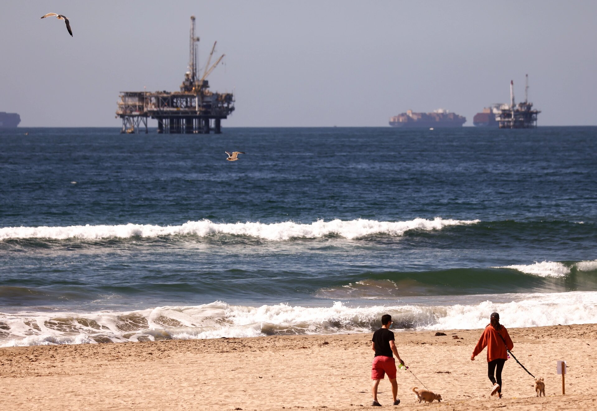 Offshore oil platforms seen from Huntington Beach, California, in 2021. Companies are producing oil and gas off the California coast in territory originally leased by the mid-1980s, but drilling there has declined for decades. | Mario Tama/Getty Images