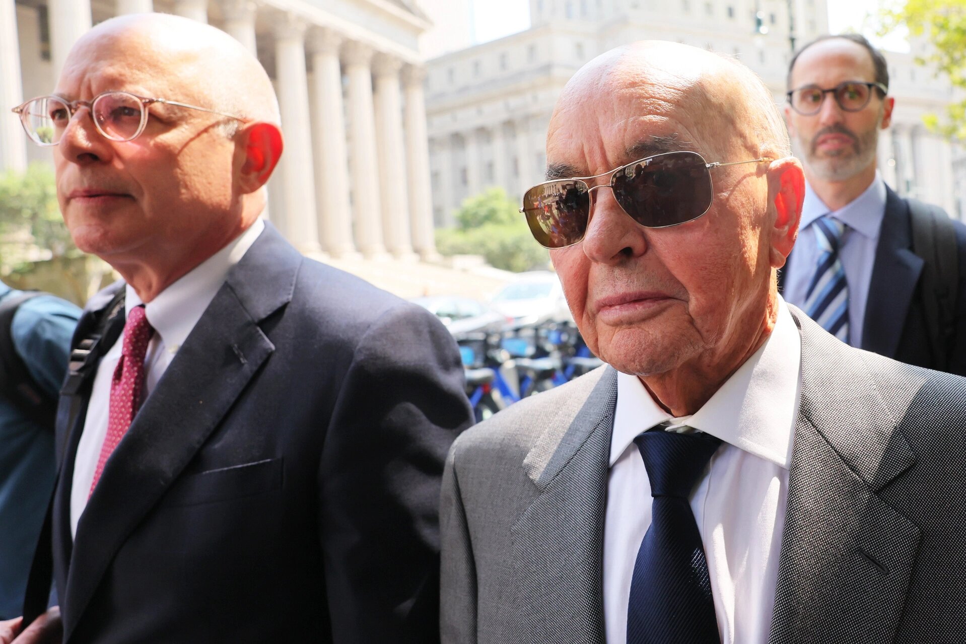 British billionaire owner of Tottenham Hotspur Joe Lewis (right) is escorted by his attorneys after leaving Manhattan Federal Court on July 26, 2023 in New York City. | Michael M. Santiago/Getty Images