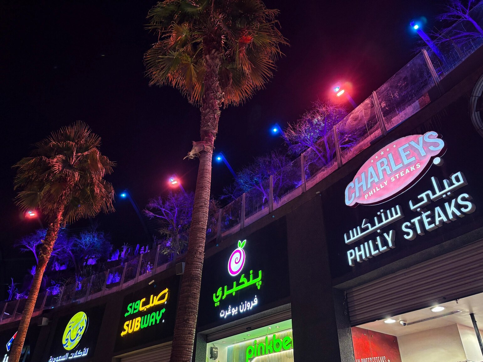 Now, Saudi Arabia’s strip malls and shopping centers are chockablock with U.S. fast food, consumer brands and pop relics. Social restrictions are plainly visible — women ride in separate subway cars — but I also saw a woman in an abaya bopping to Akon’s “Smack That” while working in a bowling alley. Handprints of celebrities like Jennifer Lopez and Mel Gibson populate walkways in one of the city’s new entertainment districts. It’s an authoritarian speedrun toward the cultural aesthetics of a Sun Belt suburb.